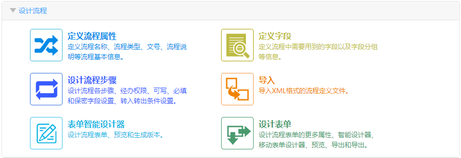 设计流程包括:定义流程属性、定义字段、设计流程步骤、导入、表单智能设计器、设计表单。定义流程是用于定义流程的基本属性。