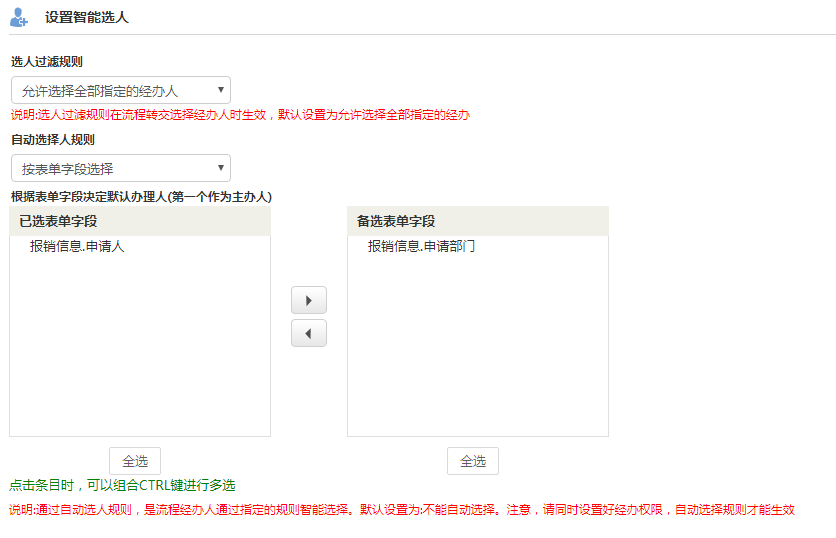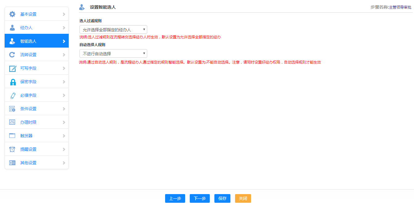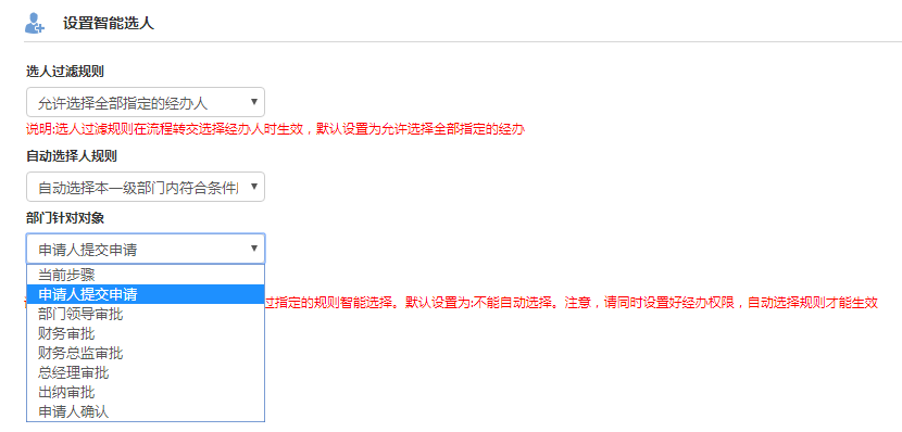 智能选人:父流程走向子流程步骤支持智能选人功能,和固定流程智能选人一样,在此不再详细说明。注:如果返回步骤中设置了人员,智能选人中又设置了人员,则会优先选择返回步骤中的人员。