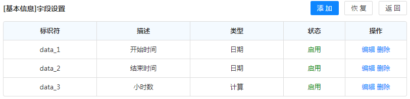 首先,建立好需要参与计算的项目,如图建立好“出差开始日期”和“出差截止日期”这两个日期字段: