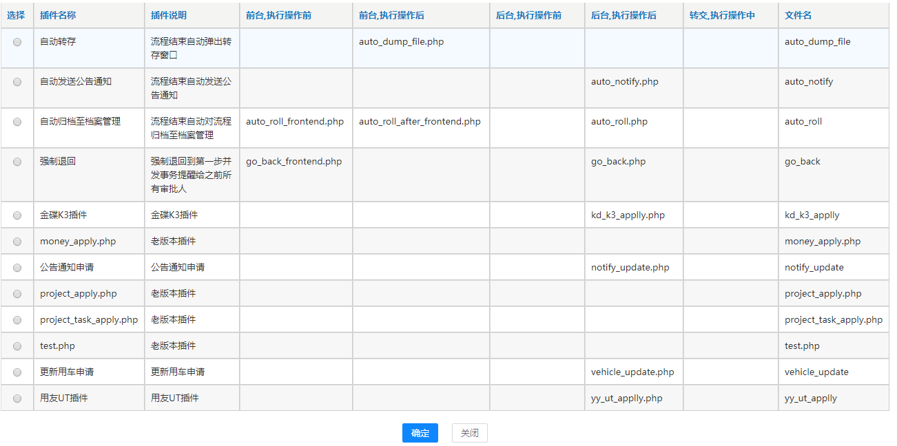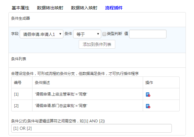 第四步,设置流程插件,界面类似于流程步骤的条件设置,如下图: