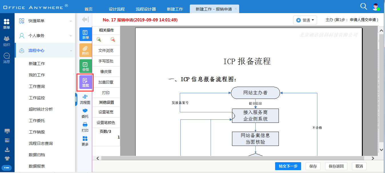 进入OA系统流程中心->流程中心设置->设计流程,可以对各流程进行定义和管理。Office Anywhere 11.0流程中心采用全新的设计流程向导模式,简化了流程中心设计过程,同时将流程定义的相关操作统一在同一个页面,使人一目了然