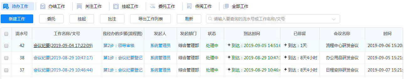 设置完扩展字段在流程中心我的工作或工作查询中,查询该流程的工作时,列表的显示字段会增加上面设置的扩展字段,如图: