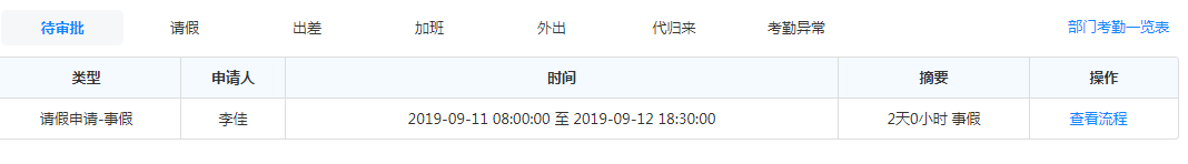 然后转交流程,和流程中心模块的普通流程是一样的,审批人在流程中心模块进行审批,也可以在考勤审批模块查看该申请。