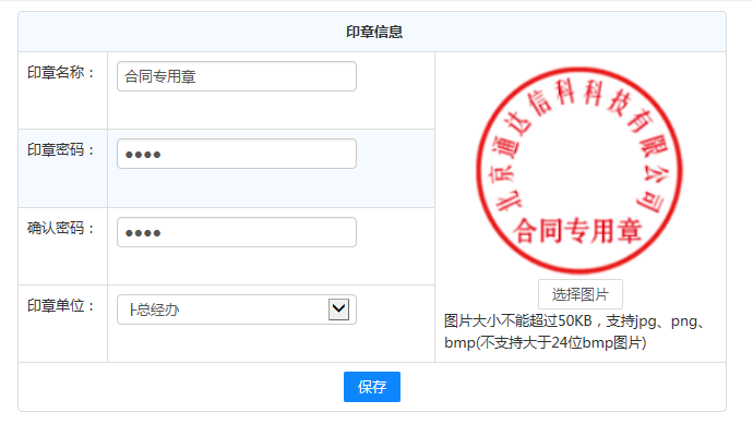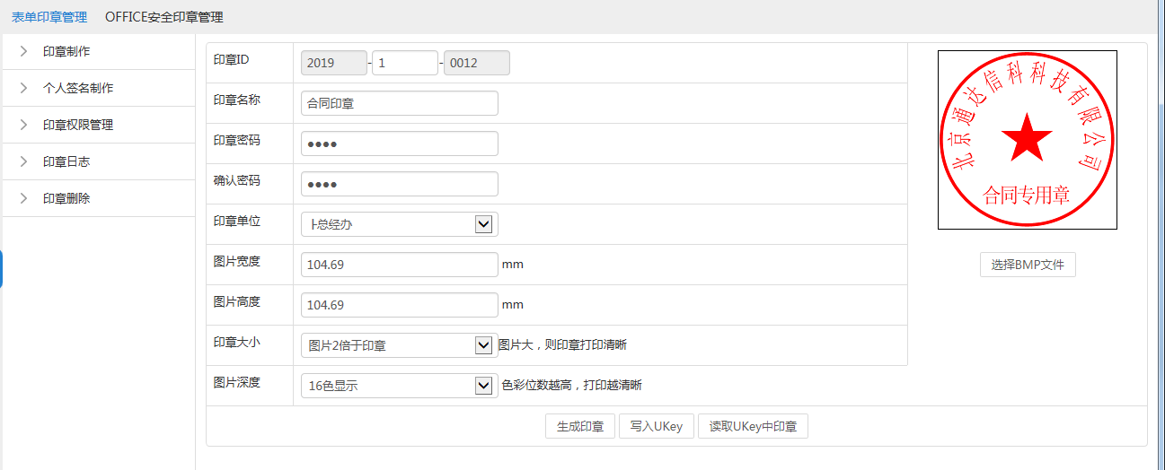 印章制作:填写印章的基本信息,选择bmp文件点击【生成】印章即可。制作好的印章存储在数据库中,印章来源设置为“数据库”后,就可以在表单上使用制作好的印章了,另外,在个人事务控制面板可以修改自己有使用权限的印章密码。
