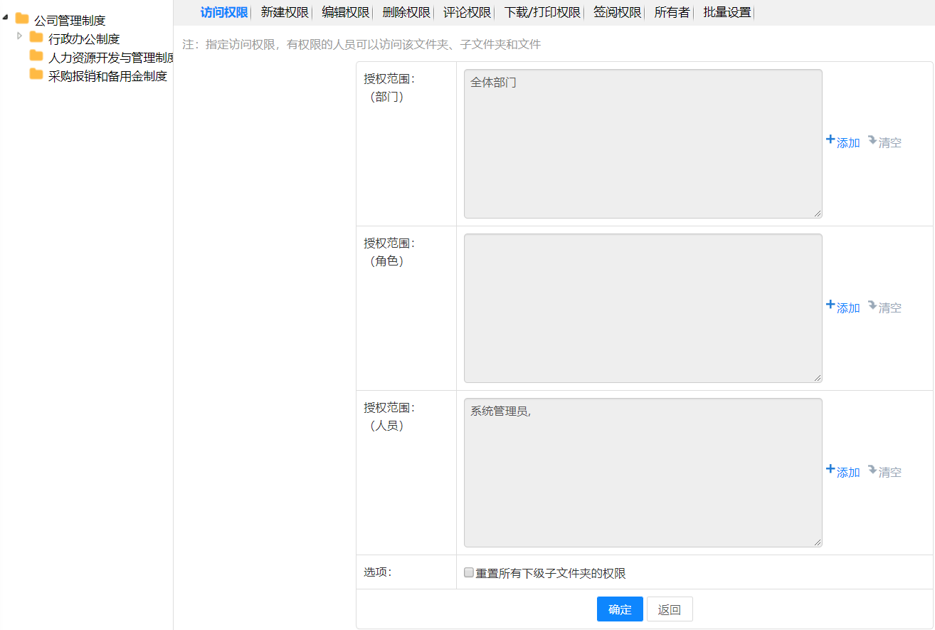 管理员可以指定文件夹的“访问权限”、“新建权限”、“编辑权限”、“删除权限”、“下载/打印权限”和“所有者”权限,设置都在“权限设置”中进行,权限设置界面。