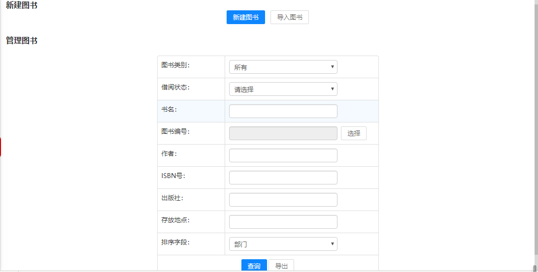 可新建图书、批量导入图书、查询图书和导出图书信息。