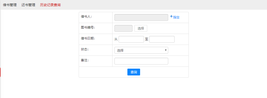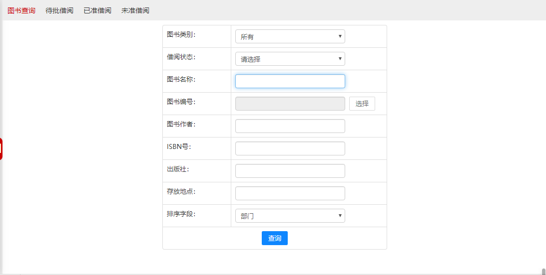 图书查询包含“图书查询”、“待批借阅”、“已准借阅”和“未准借阅”四个功能。后三个功能是图书管理员可以对借阅的申请进行分类查看。