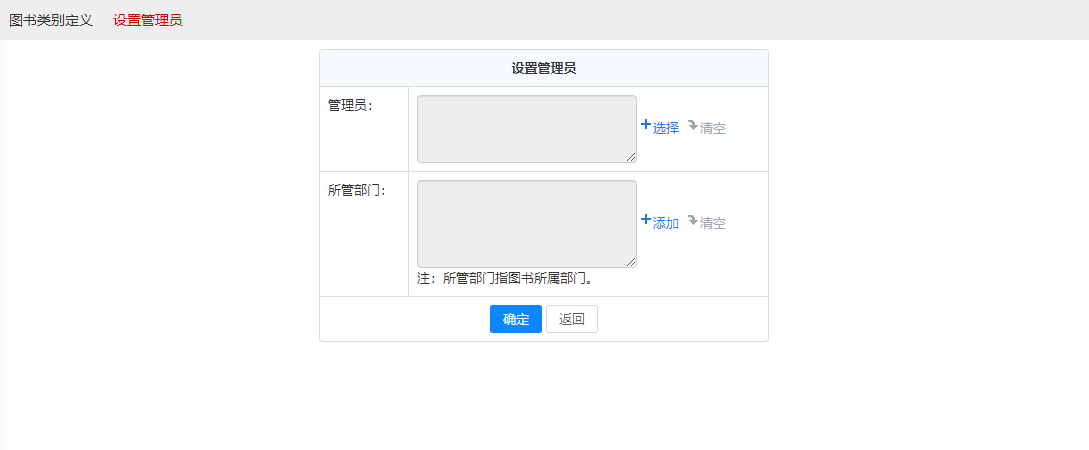 图书管理设置中可以对图书类别定义和图书管理员进行设置。