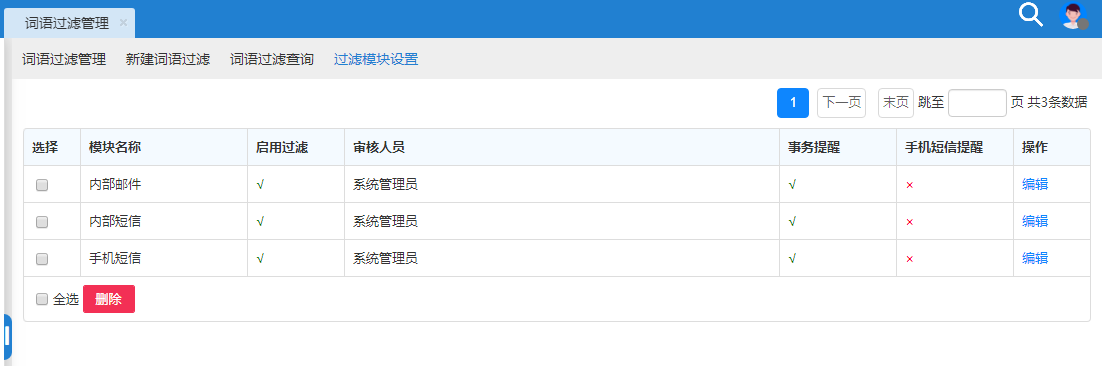 过滤模块设置:在此设定哪些模块需要启用词语过滤,并分别设定审核人员和提醒方式。