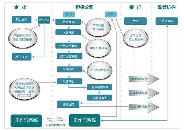 自动校验、数据自动关联、指派委托任务、风险预警上报、风控审批、实现金融机构与企业客户的业务往来电子化、授权机制灵活、风险控制严密、数据多层次利用。